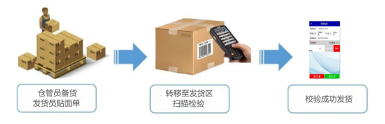 倉庫人員根據(jù)銷售人員的出貨計(jì)劃,安排銷售發(fā)貨。倉庫人員使用手持終端設(shè)備掃描源單發(fā)貨通知單,并逐一掃描成品條碼,確認(rèn)出貨數(shù)據(jù)無誤后,系統(tǒng)生成銷售出庫單。