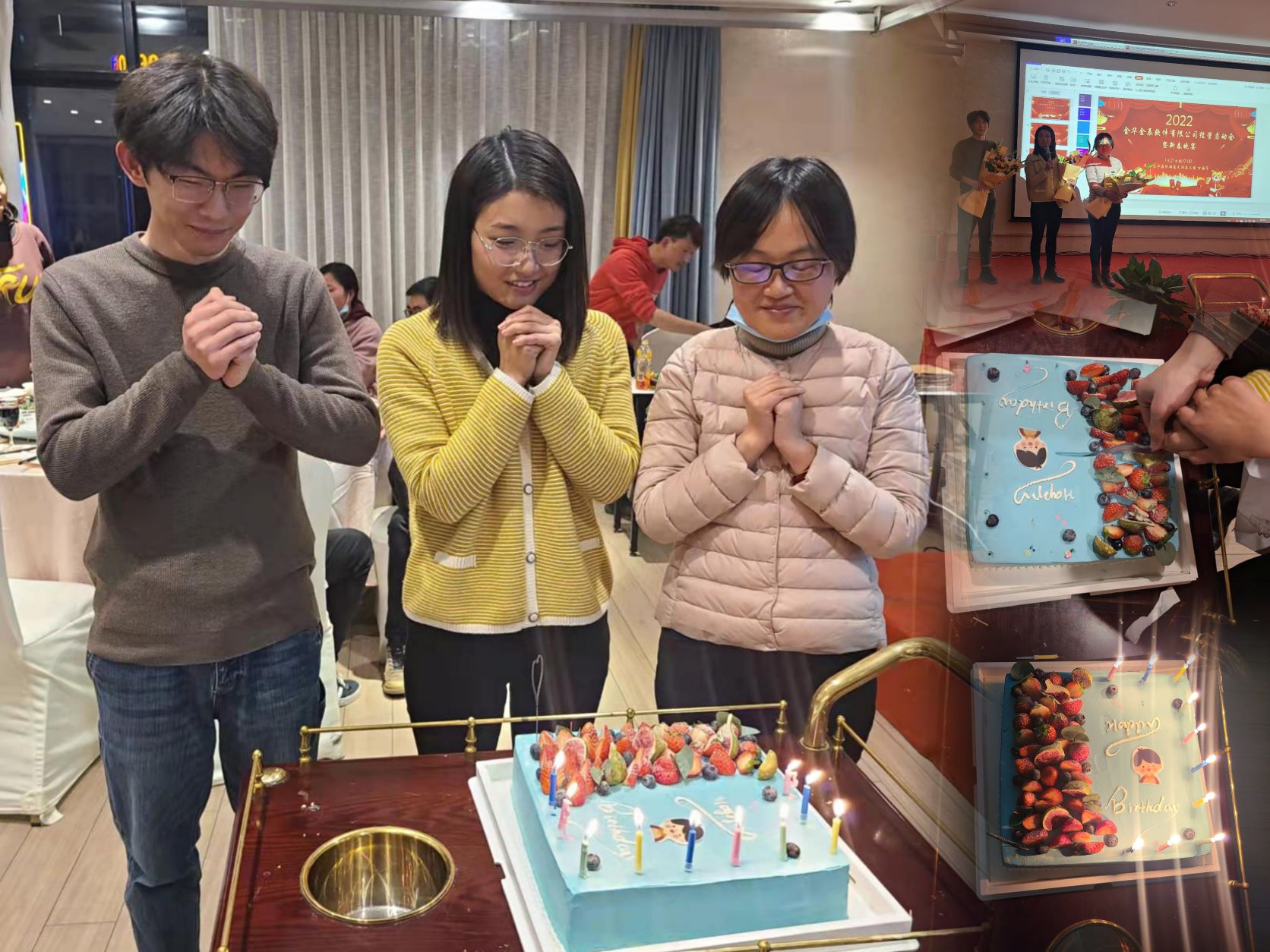 在辭舊迎新的一月份,公司為三位壽星安排了一個特別的生日會,隨著緩緩推入會場的蛋糕,三位壽星在大家的歌聲中許下愿望,把年會推上了一個新的“小高潮”。